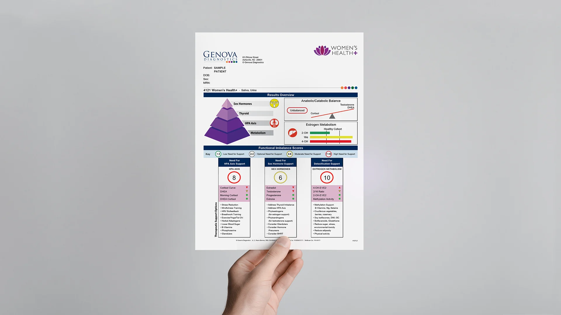 Women's health is more than just hormones. Women's Health+ looks at daily stress patterns, how estrogen is processed, nutrition + metabolism, and hormone levels.